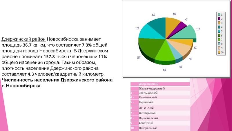 Слайд 4Дзержинский район Новосибирска занимает площадь 36.7 кв. км, что составляет 7.3%
