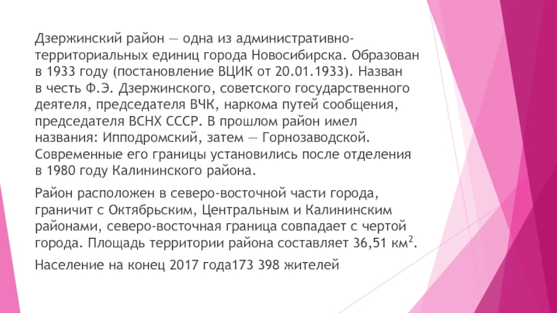 Слайд 6Дзержинский район — одна из административно-территориальных единиц города Новосибирска. Образован в 1933 году (постановление
