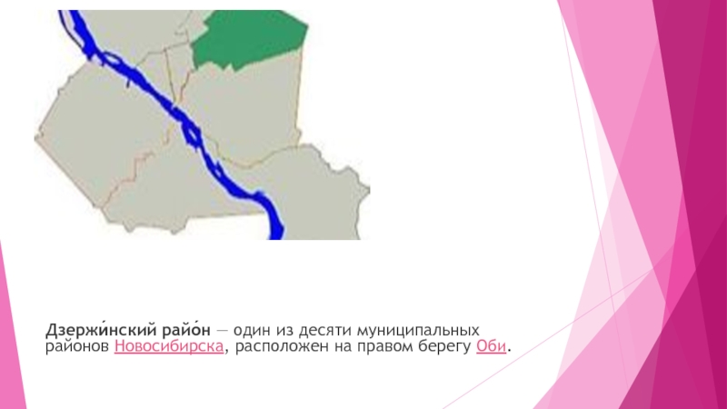 Слайд 3Дзержи́нский райо́н — один из десяти муниципальных районов Новосибирска, расположен на правом