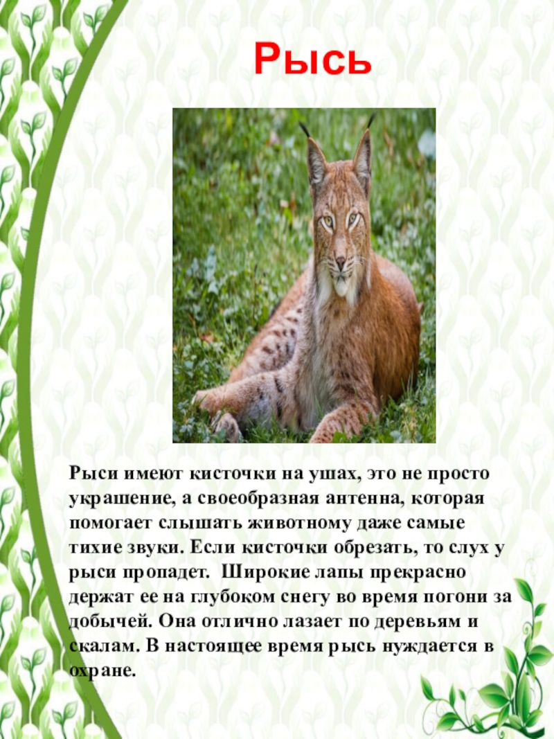 своеобразная антенна, которая помогает слышать животному даже самые тихие звуки. Если кисточки обрезать, то слух у рыси пропадет. Широкие лапы прекрасно держат ее на глубоком снегу во время погони за добычей. Она отлично лазает по деревьям и скалам. В настоящее время рысь нуждается в охране.