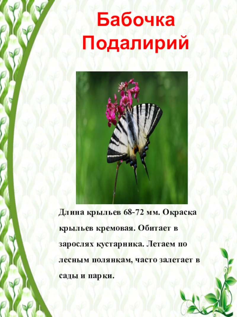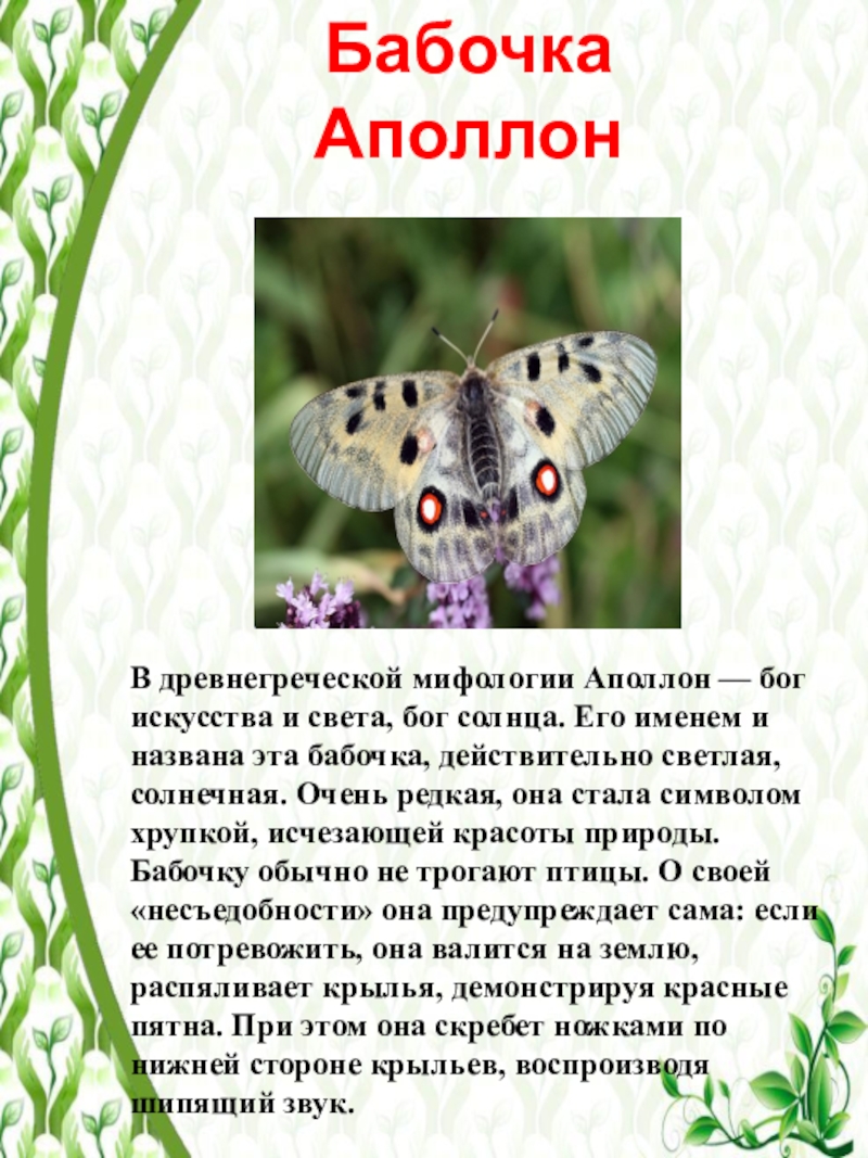солнца. Его именем и названа эта бабочка, действительно светлая, солнечная. Очень редкая, она стала символом хрупкой, исчезающей красоты природы. Бабочку обычно не трогают птицы. О своей «несъедобности» она предупреждает сама: если ее потревожить, она валится на землю, распяливает крылья, демонстрируя красные пятна. При этом она скребет ножками по нижней стороне крыльев, воспроизводя шипящий звук.