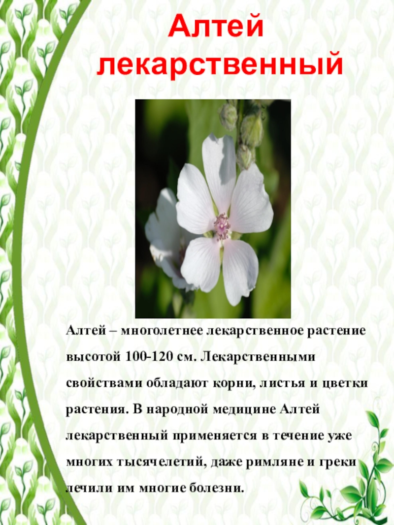 Алтей – многолетнее лекарственное растение высотой 100-120 см. Лекарственными
