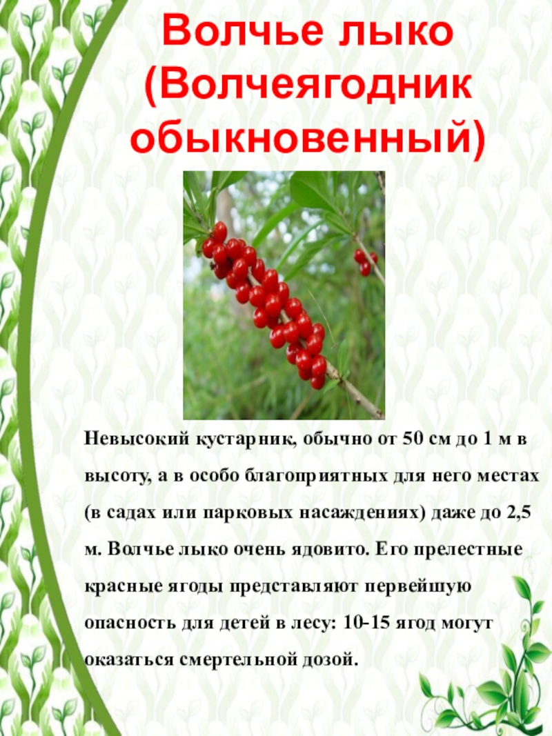 м в высоту, а в особо благоприятных для него местах (в садах или парковых насаждениях) даже до 2,5 м. Волчье лыко очень ядовито. Его прелестные красные ягоды представляют первейшую опасность для детей в лесу: 10-15 ягод могут оказаться смертельной дозой.
