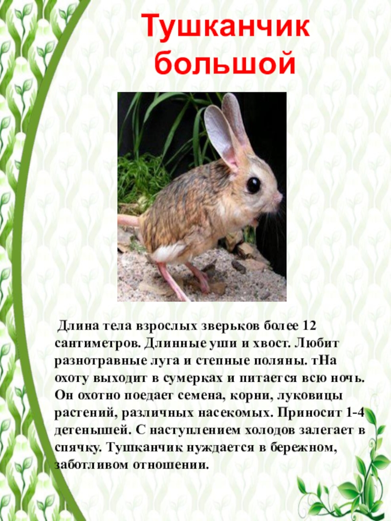 и хвост. Любит разнотравные луга и степные поляны. тНа охоту выходит в сумерках и питается всю ночь. Он охотно поедает семена, корни, луковицы растений, различных насекомых. Приносит 1-4 детенышей. С наступлением холодов залегает в спячку. Тушканчик нуждается в бережном, заботливом отношении.
