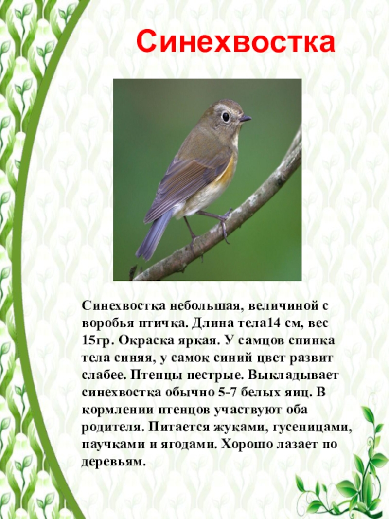 Синехвостка небольшая, величиной с воробья птичка. Длина тела14 см, вес