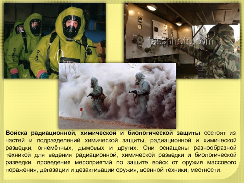 химической защиты, радиационной и химической разведки, огнемётных, дымовых и других. Они оснащены разнообразной техникой для ведения радиационной, химической разведки и биологической разведки, проведения мероприятий по защите войск от оружия массового поражения, дегазации и дезактивации оружия, военной техники, местности.