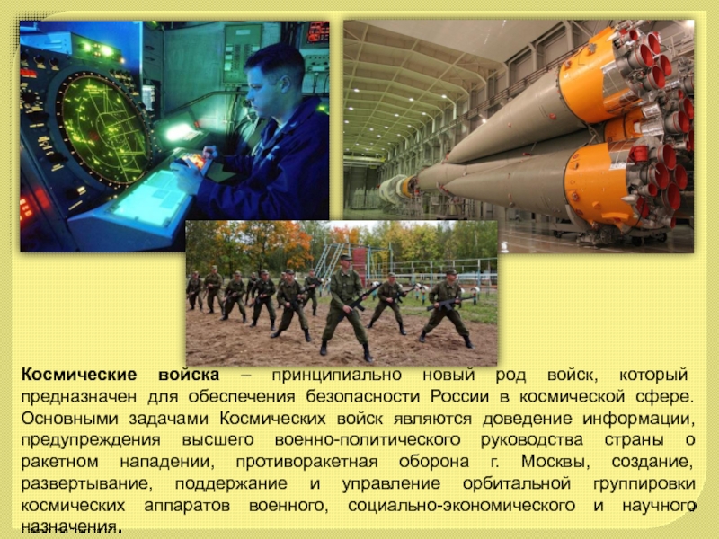 Слайд 15Космические войска – принципиально новый род войск, который предназначен для обеспечения