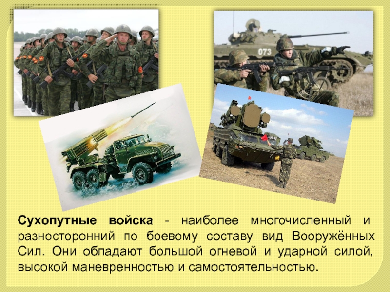 Слайд 11Сухопутные войска - наиболее многочисленный и разносторонний по боевому составу вид