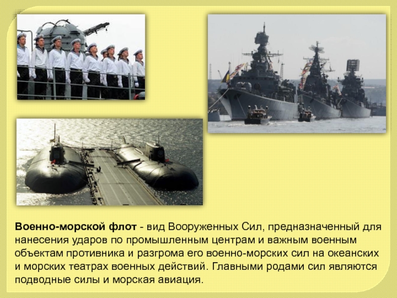 Слайд 13Военно-морской флот - вид Вооруженных Сил, предназначенный для нанесения ударов по