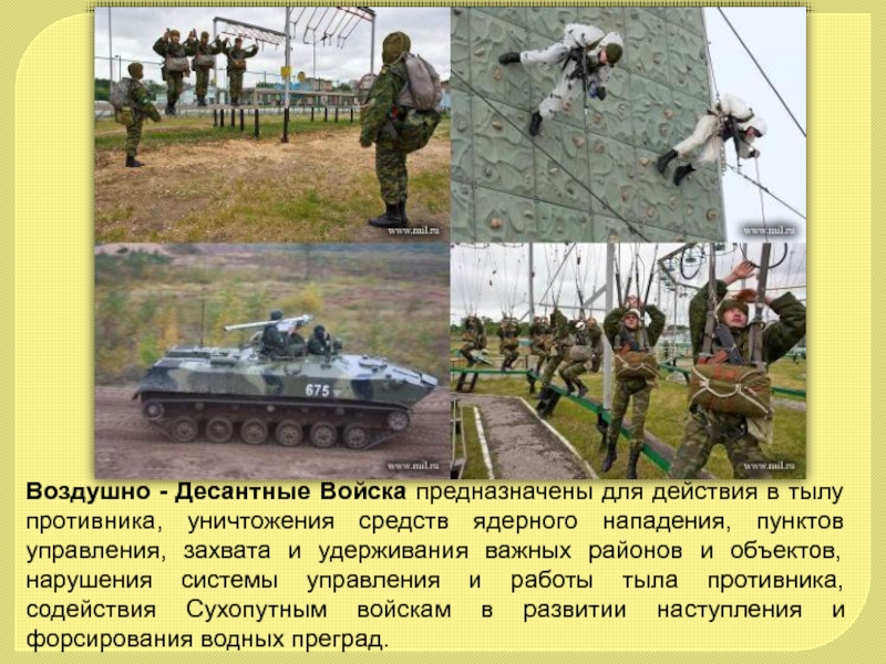 Слайд 16Воздушно - Десантные Войска предназначены для действия в тылу противника, уничтожения