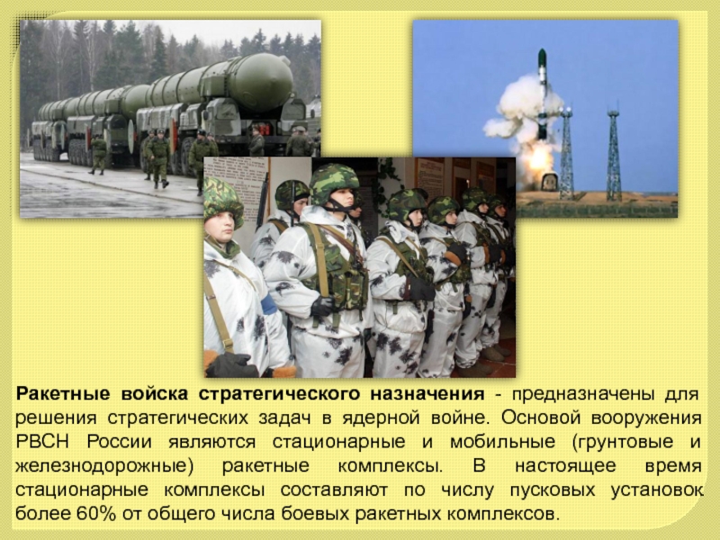 Слайд 14Ракетные войска стратегического назначения - предназначены для решения стратегических задач в