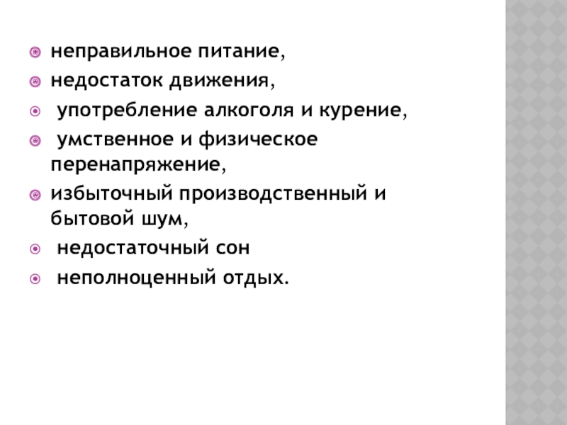 неправильное питание, недостаток движения, употребление алкоголя и курение, умственное и физическое перенапряжение, избыточный производственный и бытовой шум,