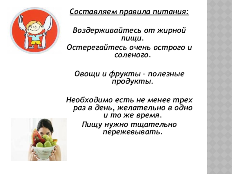Составляем правила питания: Воздерживайтесь от жирной пищи. Остерегайтесь очень острого и соленого. Овощи и фрукты – полезные продукты.Необходимо