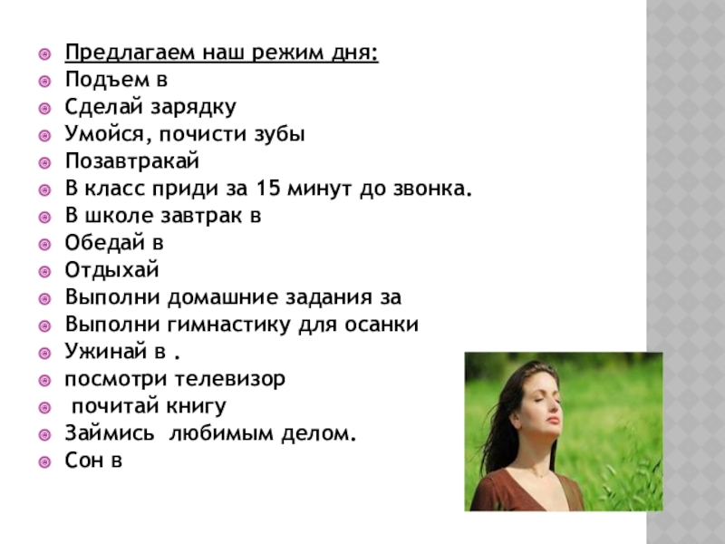 Предлагаем наш режим дня:Подъем в Сделай зарядкуУмойся, почисти зубыПозавтракайВ класс приди за 15 минут до звонка.В школе