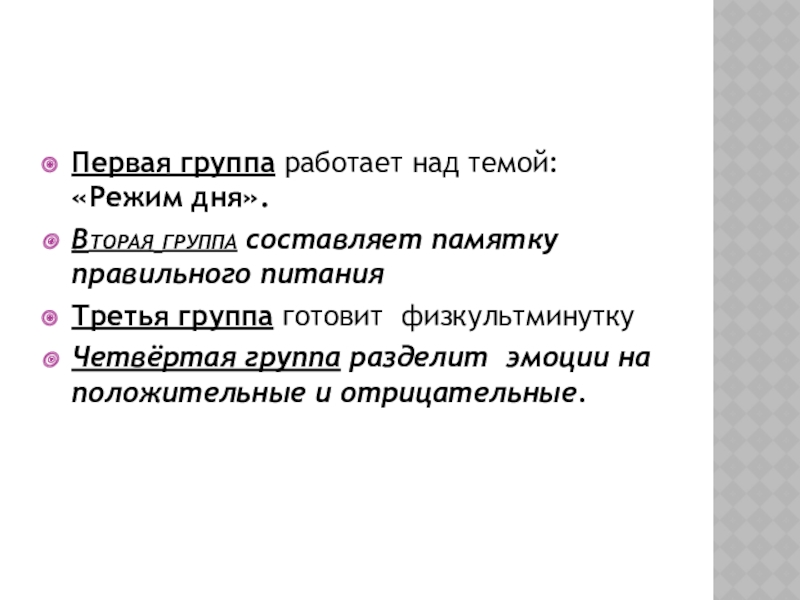 Первая группа работает над темой: «Режим дня». Вторая группа составляет памятку правильного питанияТретья группа готовит физкультминутку Четвёртая
