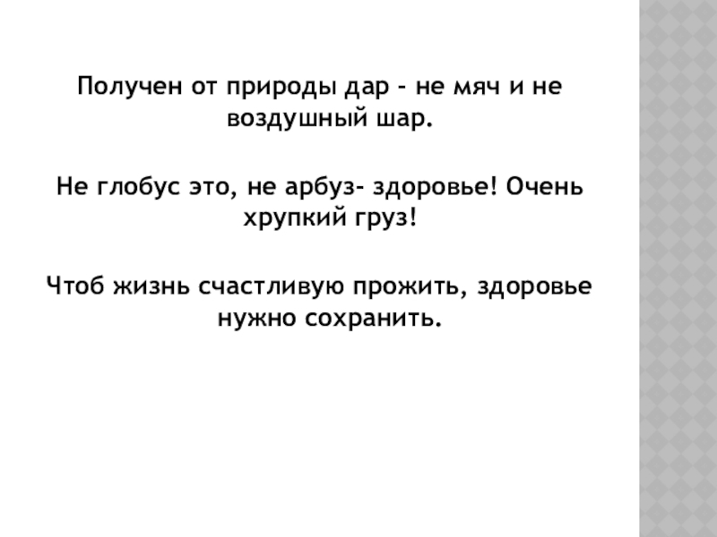 Получен от природы дар - не мяч и не воздушный шар. Не глобус это, не арбуз- здоровье! Очень хрупкий груз! Чтоб жизнь счастливую прожить, здоровье нужно сохранить.
