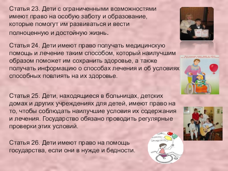 Статья 25. Дети, находящиеся в больницах, детских домах и других учреждениях для детей, имеют право на то, чтобы соблюдать наилучшие условия их содержания и лечения. Государство обязано проводить регулярные проверки этих условий.