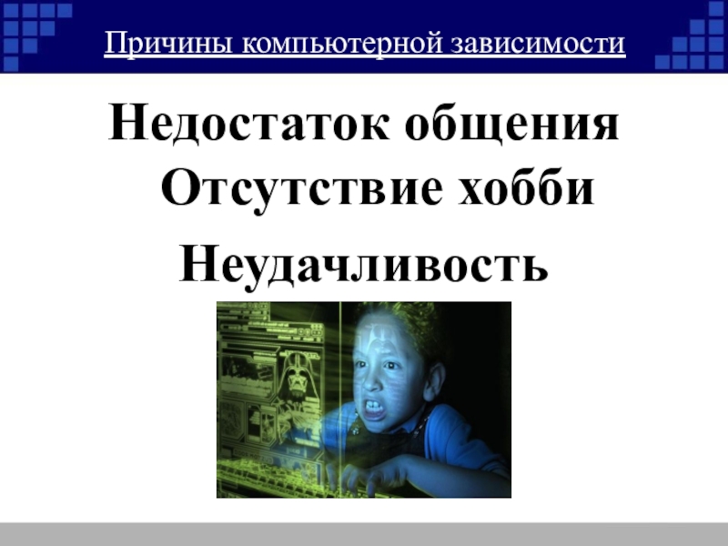 Причины компьютерной зависимостиНедостаток общения Отсутствие хоббиНеудачливость