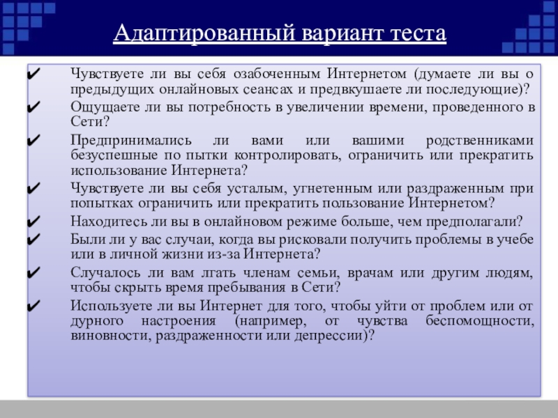 Адаптированный вариант тестаЧувствуете ли вы себя озабоченным Интернетом (думаете ли вы о предыдущих онлайновых сеансах и предвкушаете