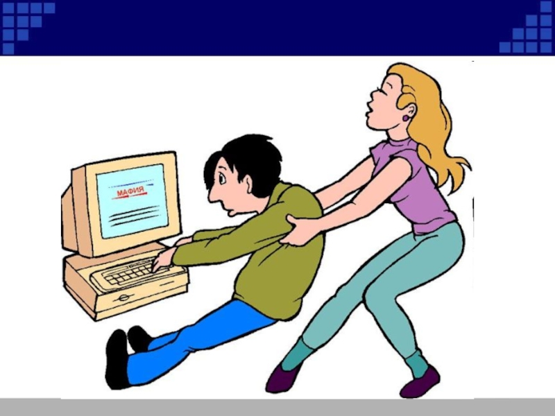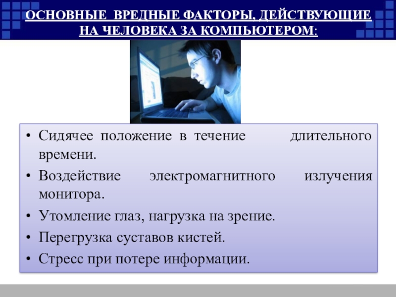 Слайд 9ОСНОВНЫЕ ВРЕДНЫЕ ФАКТОРЫ, ДЕЙСТВУЮЩИЕ НА ЧЕЛОВЕКА ЗА КОМПЬЮТЕРОМ: