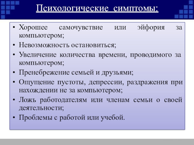 Психологические симптомы: Хорошее самочувствие или эйфория за компьютером; Невозможность остановиться; Увеличение количества времени, проводимого за компьютером; Пренебрежение