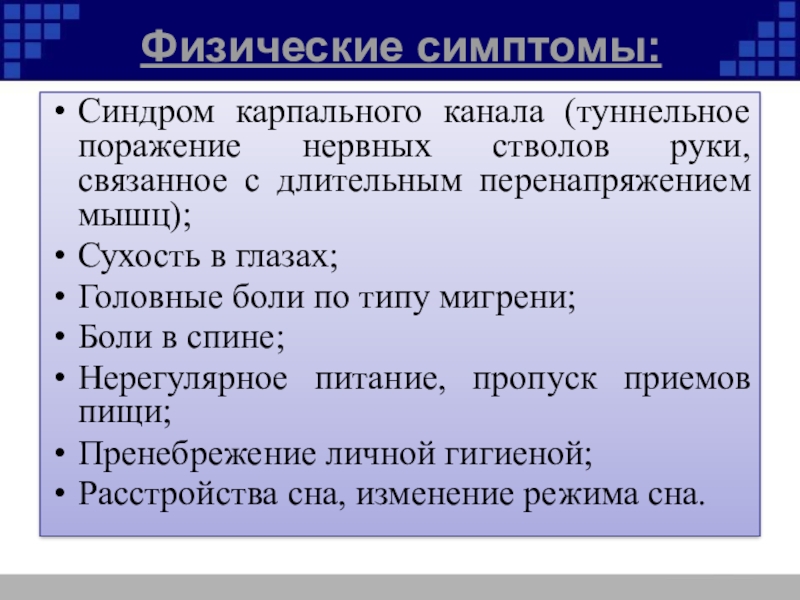 Физические симптомы:Синдром карпального канала (туннельное поражение нервных стволов руки, связанное с длительным перенапряжением мышц); Сухость в глазах;