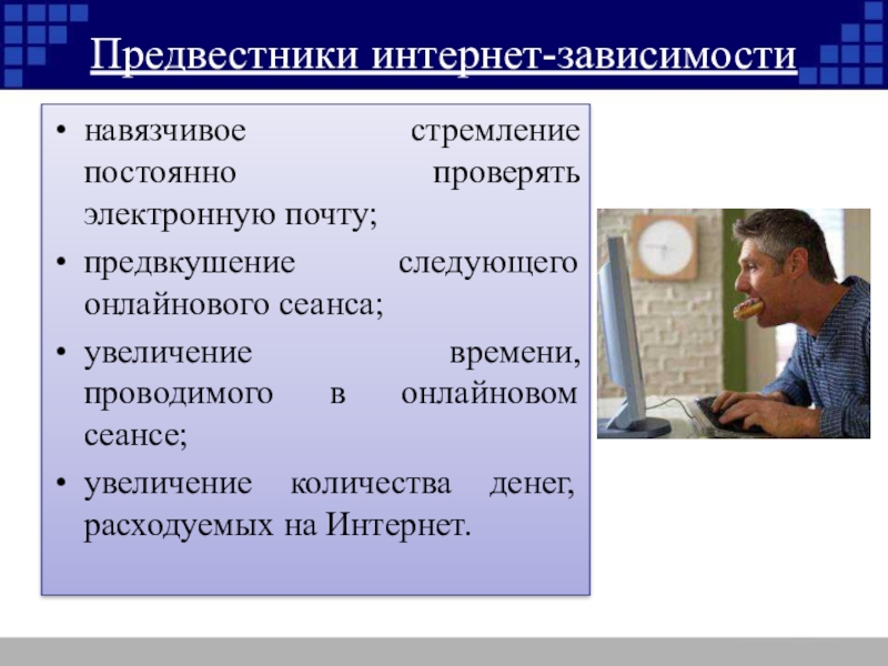 Предвестники интернет-зависимостинавязчивое стремление постоянно проверять электронную почту; предвкушение следующего онлайнового сеанса; увеличение времени, проводимого в онлайновом сеансе;