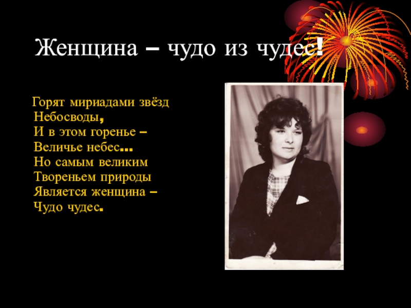Женщина – чудо из чудес!  Горят мириадами звёзд Небосводы, И в этом горенье – Величье небес…