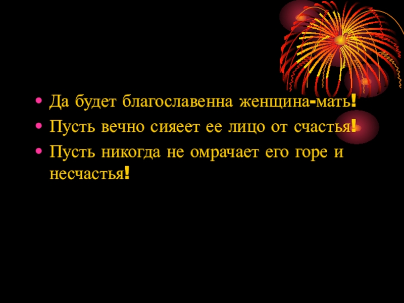 Да будет благославенна женщина-мать!Пусть вечно сияеет ее лицо от счастья!Пусть никогда не омрачает его горе и несчастья!