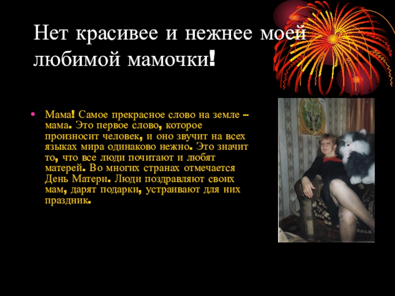 земле – мама. Это первое слово, которое произносит человек, и оно звучит на всех языках мира одинаково нежно. Это значит то, что все люди почитают и любят матерей. Во многих странах отмечается День Матери. Люди поздравляют своих мам, дарят подарки, устраивают для них праздник.
