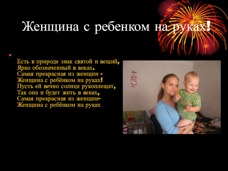 обозначенный в веках. Самая прекрасная из женщин - Женщина с ребёнком на руках! Пусть ей вечно солнце рукоплещет, Так она и будет жить в веках, Самая прекрасная из женщин- Женщина с ребёнком на руках