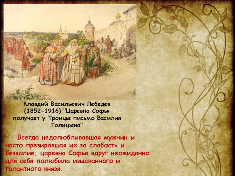 Всегда недолюбливавшая мужчин и часто презиравшая их за слабость и безволие, царевна Софья вдруг неожиданно для себя полюбила изысканного и галантного князя.