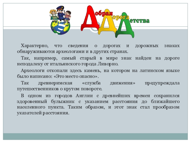 Слайд 5 Характерно, что сведения о дорогах и дорожных знаках обнаруживаются археологами и