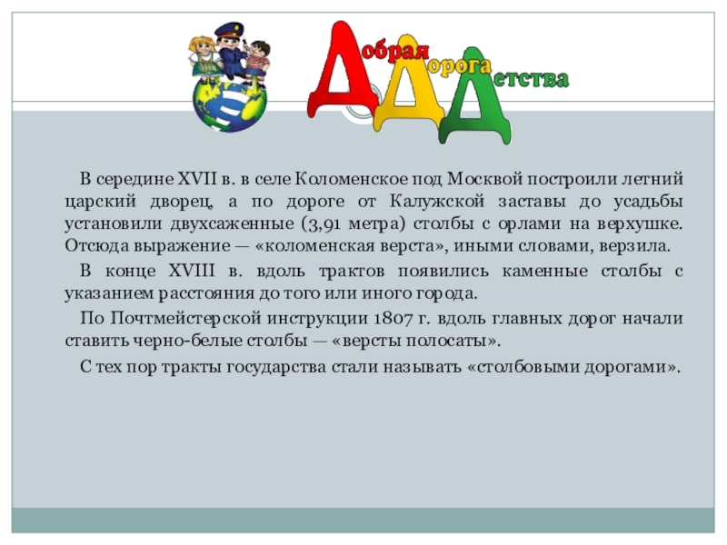 По Почтмейстерской инструкции 1807 г. вдоль главных дорог начали ставить черно-белые столбы — «версты полосаты».