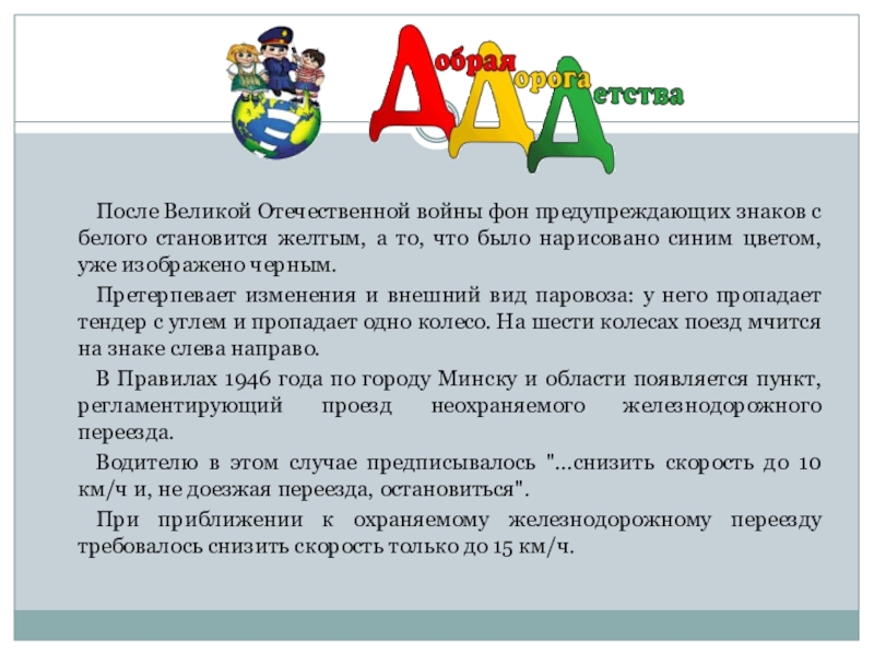 Слайд 10 После Великой Отечественной войны фон предупреждающих знаков с белого становится желтым,