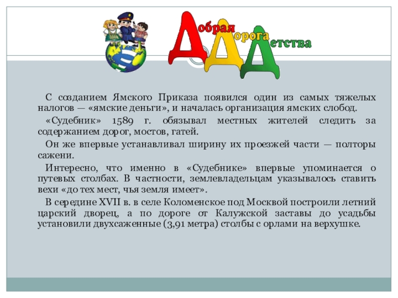 Интересно, что именно в «Судебнике» впервые упоминается о путевых столбах. В частности, землевладельцам указывалось ставить вехи «до тех мест, чья земля имеет».