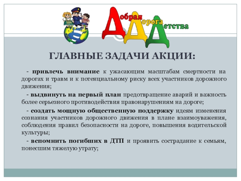 - привлечь внимание к ужасающим масштабам смертности на дорогах
