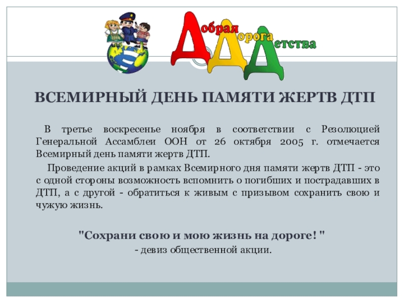 Слайд 18ВСЕМИРНЫЙ ДЕНЬ ПАМЯТИ ЖЕРТВ ДТП