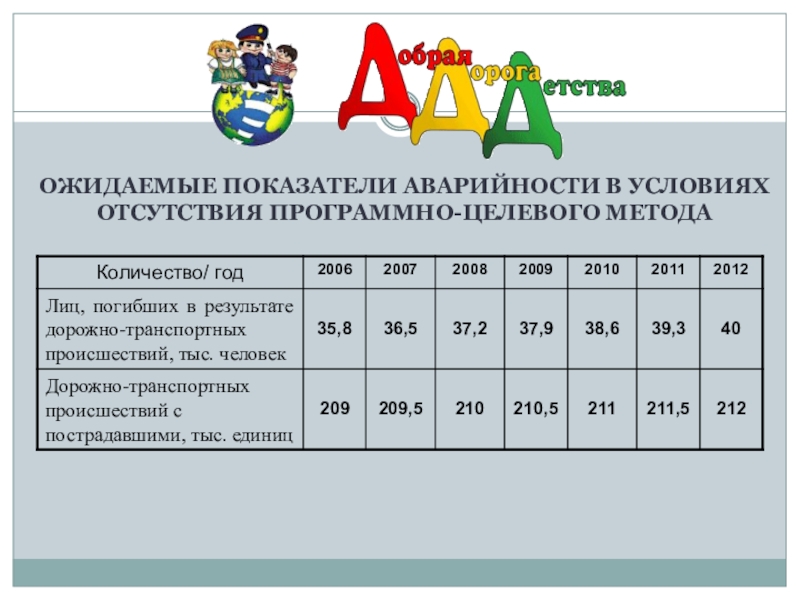 Слайд 15ОЖИДАЕМЫЕ ПОКАЗАТЕЛИ АВАРИЙНОСТИ В УСЛОВИЯХ ОТСУТСТВИЯ ПРОГРАММНО-ЦЕЛЕВОГО МЕТОДА