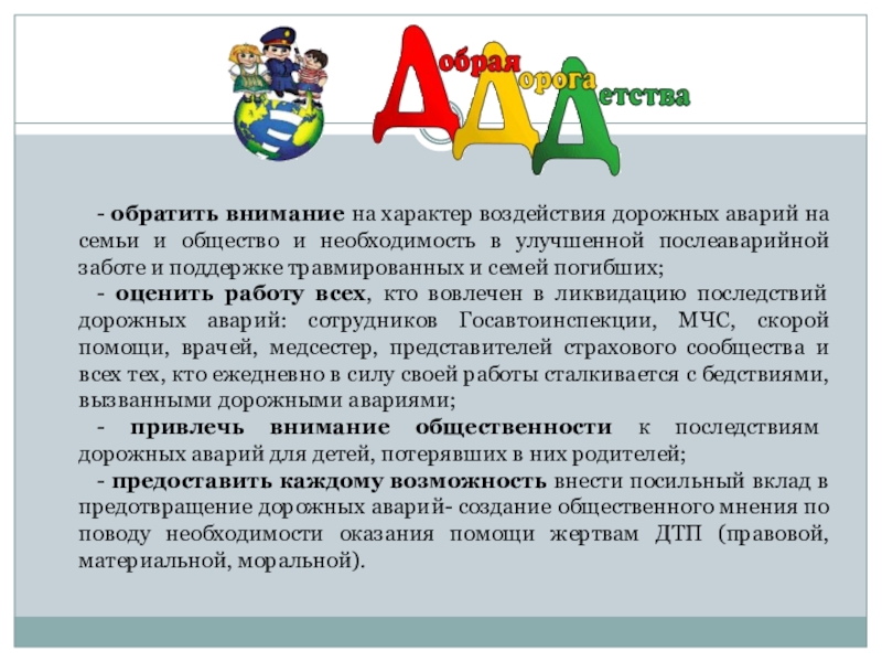 - предоставить каждому возможность внести посильный вклад в предотвращение дорожных аварий- создание общественного мнения по поводу необходимости оказания помощи жертвам ДТП (правовой, материальной, моральной).