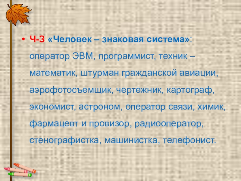 Ч-З «Человек – знаковая система»: оператор ЭВМ, программист, техник – математик,