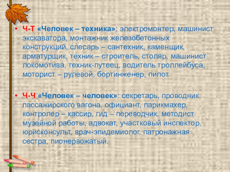 Ч-Ч «Человек – человек»: секретарь, проводник пассажирского вагона, официант, парикмахер, контролер – кассир, гид – переводчик, методист музейной работы, адвокат, участковый инспектор, юрисконсульт, врач-эпидемиолог, патронажная сестра, пионервожатый.