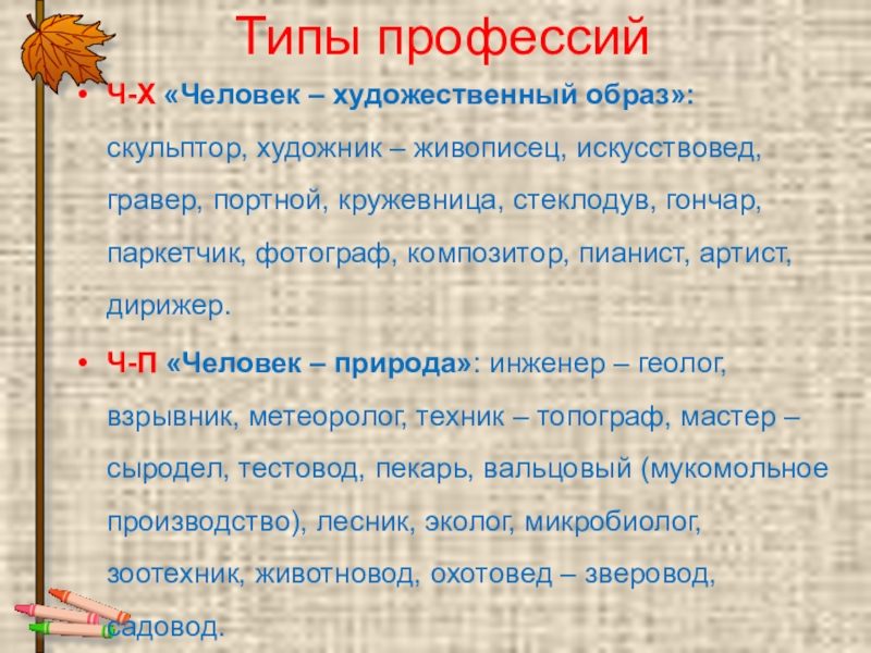 Ч-П «Человек – природа»: инженер – геолог, взрывник, метеоролог, техник – топограф, мастер – сыродел, тестовод, пекарь, вальцовый (мукомольное производство), лесник, эколог, микробиолог, зоотехник, животновод, охотовед – зверовод, садовод.