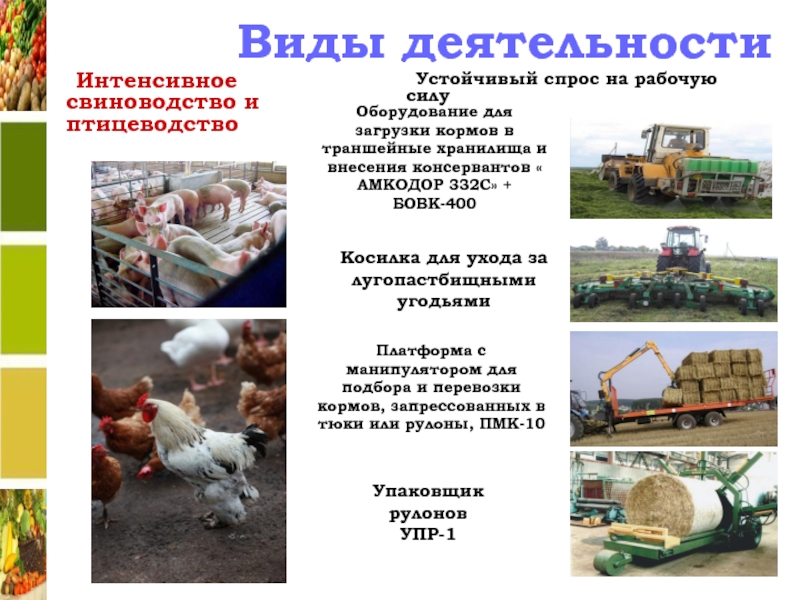 Для производства нескольких видов культур может применяться один вид техники (тракторы, плуги, культиваторы, сеялки, комбайны зерноуборочные, кукурузоуборочные, кормоуборочные, картофелеуборочные, свеклоуборочные).