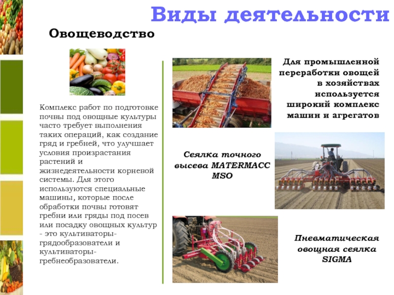 Комплекс работ по подготовке почвы под овощные культуры часто требует выполнения таких операций, как создание гряд и гребней, что улучшает условия произрастания растений и жизнедеятельности корневой системы. Для этого используются специальные машины, которые после обработки почвы готовят гребни или гряды под посев или посадку овощных культур - это культиваторы-грядообразователи и культиваторы-гребнеобразователи.