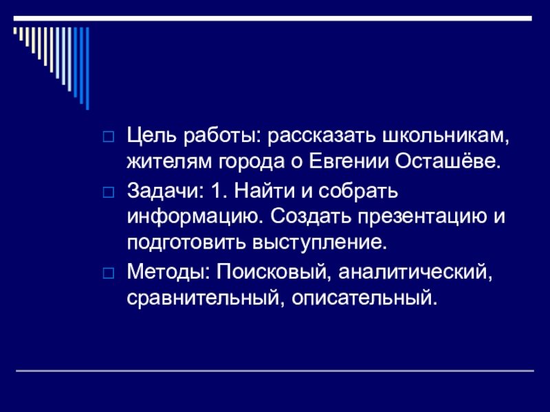Цель работы: рассказать школьникам, жителям города о Евгении Осташёве.Задачи: 1. Найти и собрать информацию. Создать презентацию и подготовить выступление.Методы: Поисковый, аналитический, сравнительный, описательный.