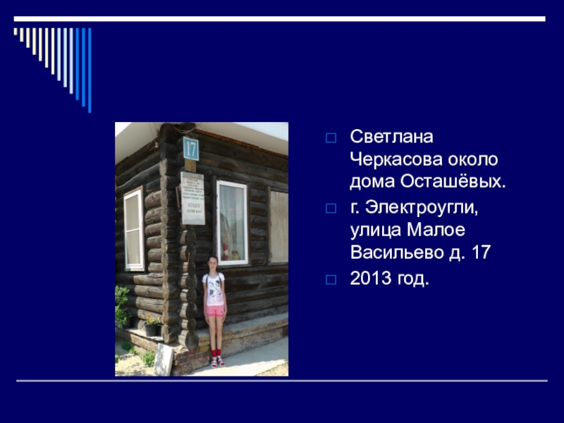 Светлана Черкасова около дома Осташёвых.г. Электроугли, улица Малое Васильево д. 172013 год.
