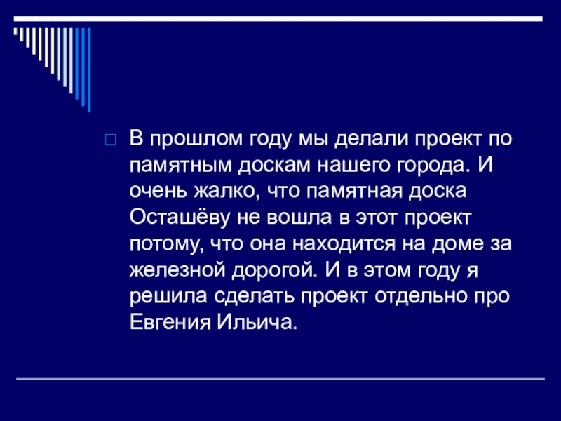 И очень жалко, что памятная доска Осташёву не вошла в этот проект потому, что она находится на доме за железной дорогой. И в этом году я решила сделать проект отдельно про Евгения Ильича.