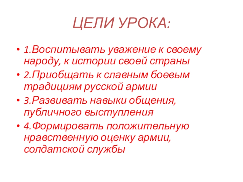 ЦЕЛИ УРОКА:1.Воспитывать уважение к своему народу, к истории своей страны2.Приобщать к славным боевым традициям русской армии3.Развивать навыки общения, публичного выступления4.Формировать положительную нравственную оценку армии, солдатской службы