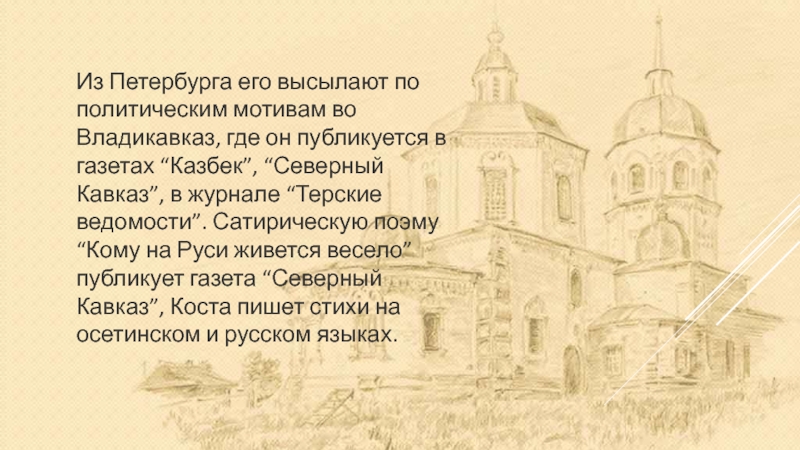Слайд 6Из Петербурга его высылают по политическим мотивам во Владикавказ, где он